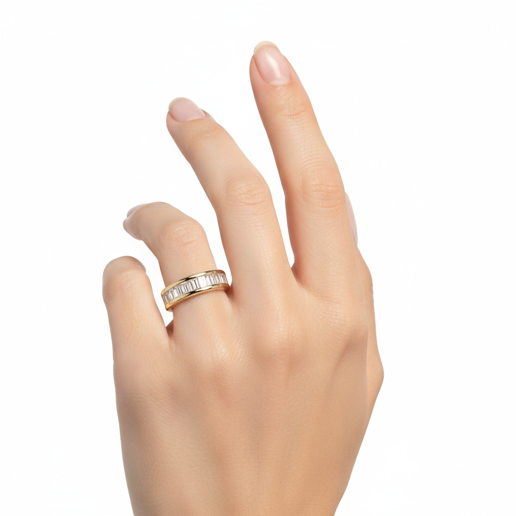 Alianza compromiso Baguette realizada en oro amarillo es una obra que fusiona la elegancia clásica con un diseño contemporáneo. El oro crea un fondo perfecto.