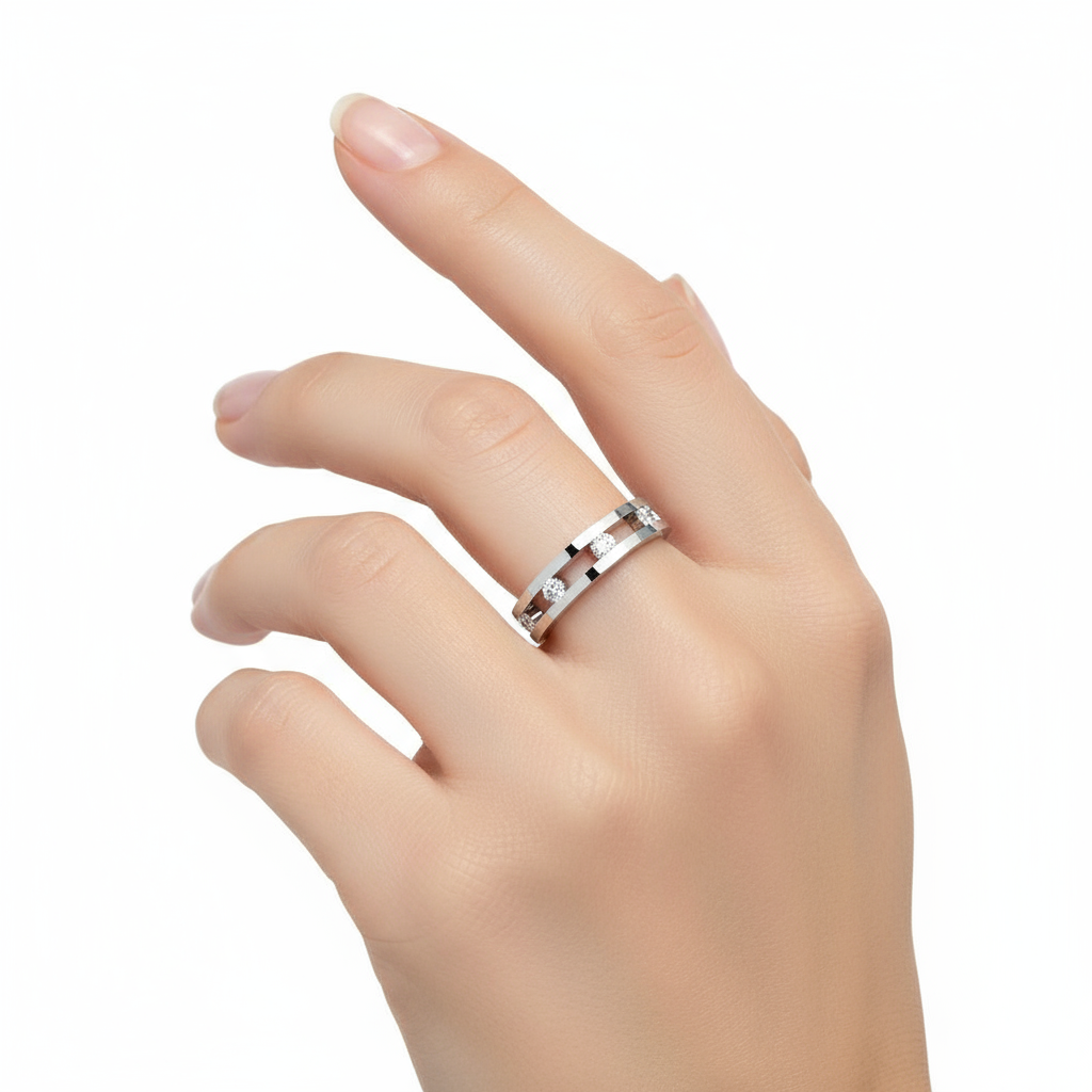 Este diseño crea un efecto al alinear los ocho brillantes en una disposición simétrica y equilibrada a lo largo del anillo.