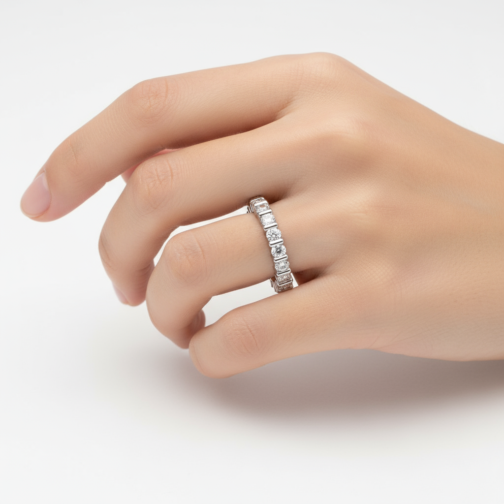 La alianza está elaborada en oro blanco, un metal precioso que otorga un brillo elegante.