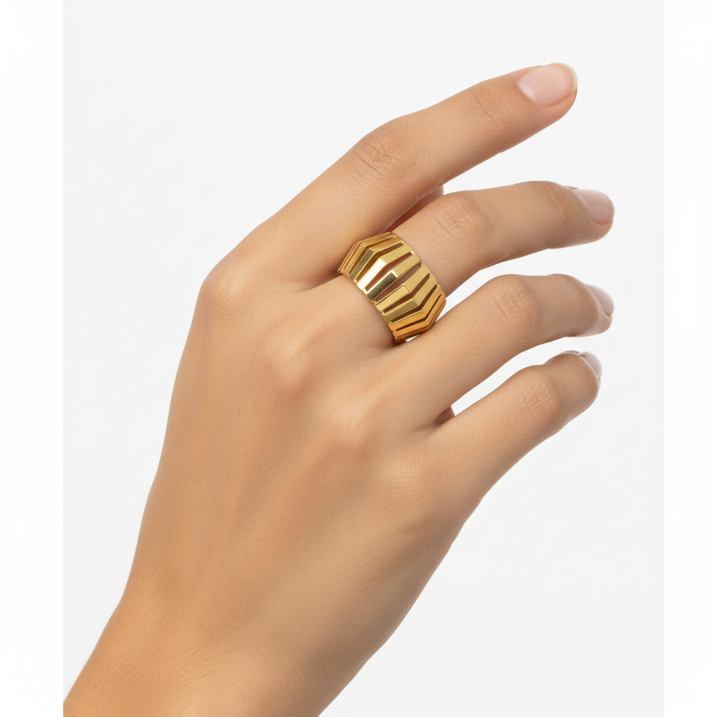 El anillo funciona como una miniatura arquitectónica: las líneas paralelas simbolizan el horizonte y la relación entre estructura y ritmo.