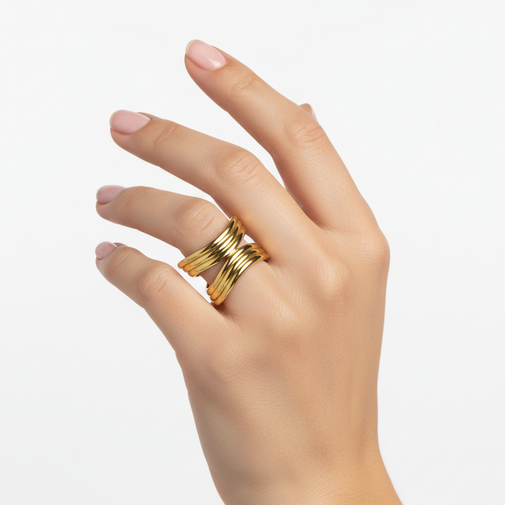 Anillo realizado artesanalmente en oro amarillo inspirado en la arquitecta Zaha Hadid.