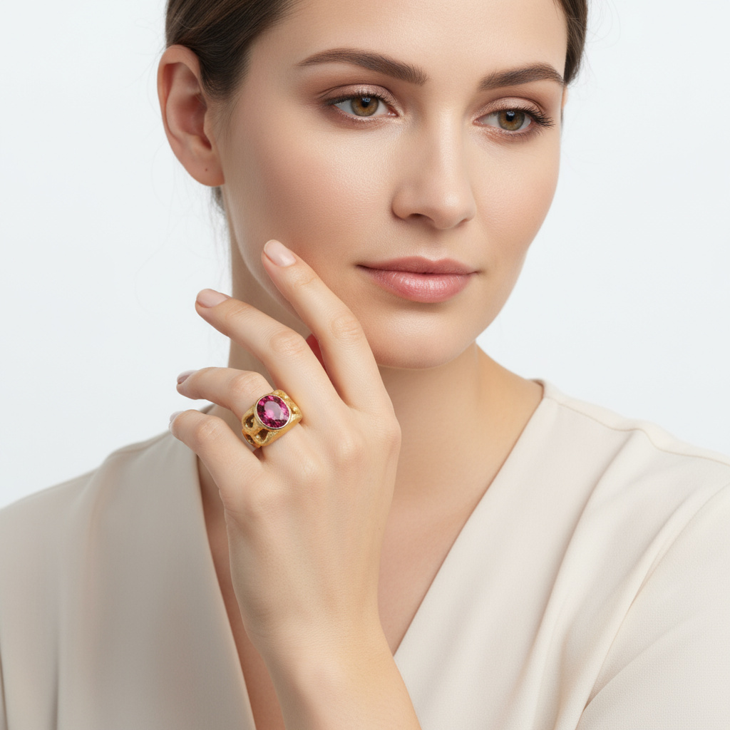 Anillo Roma realizado en oro amarillo mate con efecto rayado con Turmalina de variedad rubelita ovalada central.