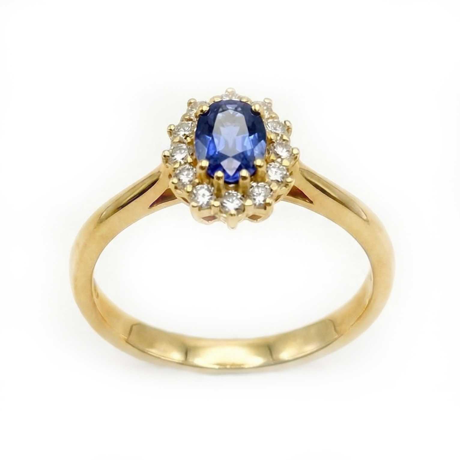 Anillo realizado artesanalmente en oro amarillo, diseñado para realzar un zafiro central talla rosetón de 0,60 quilates, rodeado por 12 diamantes talla brillante que aportan luz y contraste.