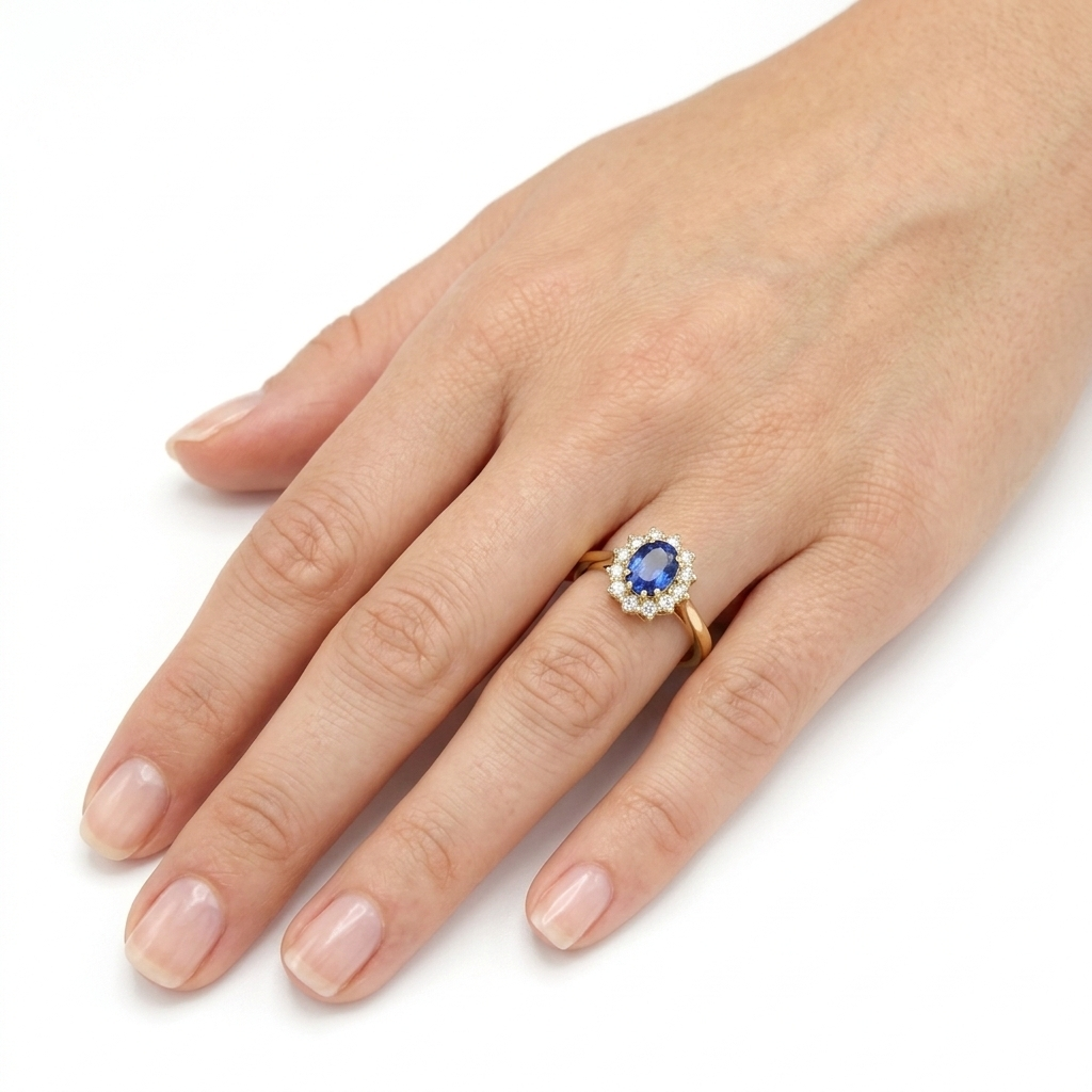 El diseño tipo rosetón crea un efecto floral y elegante, donde el azul intenso del zafiro se potencia gracias al brillo y la pureza de los diamantes circundantes.
