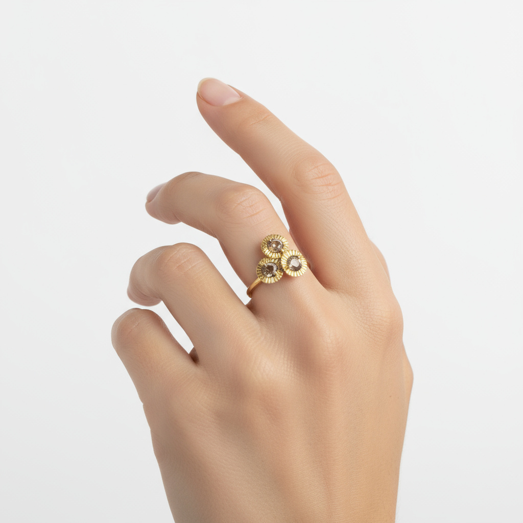 Anillo sunny diamante brown realizado artesanalmente en oro amarillo gallonado en forma de sol con tres diamantes talla rosa.