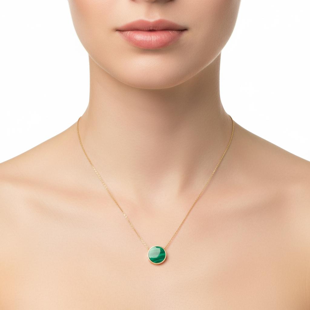 Collar realizado artesanalmente en oro amarillo con malaquita central circular.