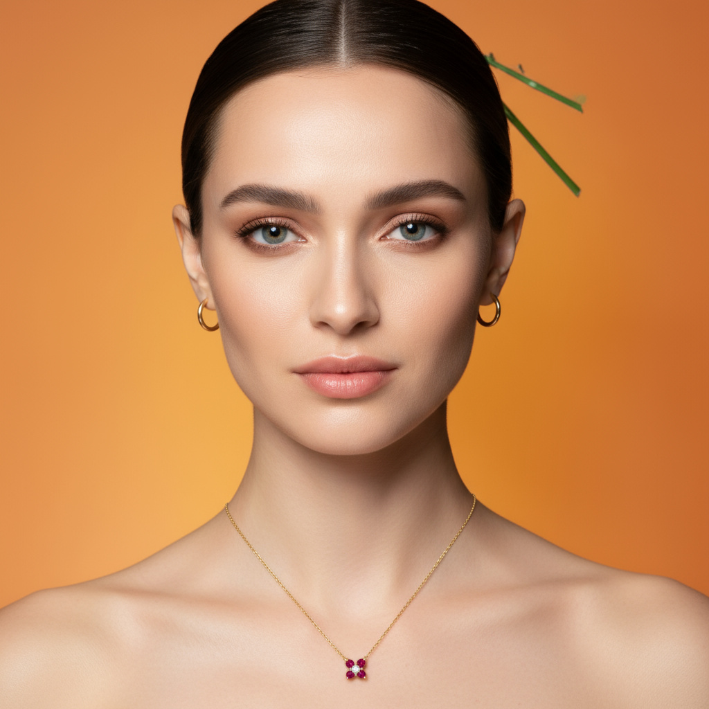 Un Collar Rubi Flor realizado por 4 pétalos de rubí rodeando a un brillante central dispuesto como el polen de una flor es una pieza de joyería impresionante y llena de significado.