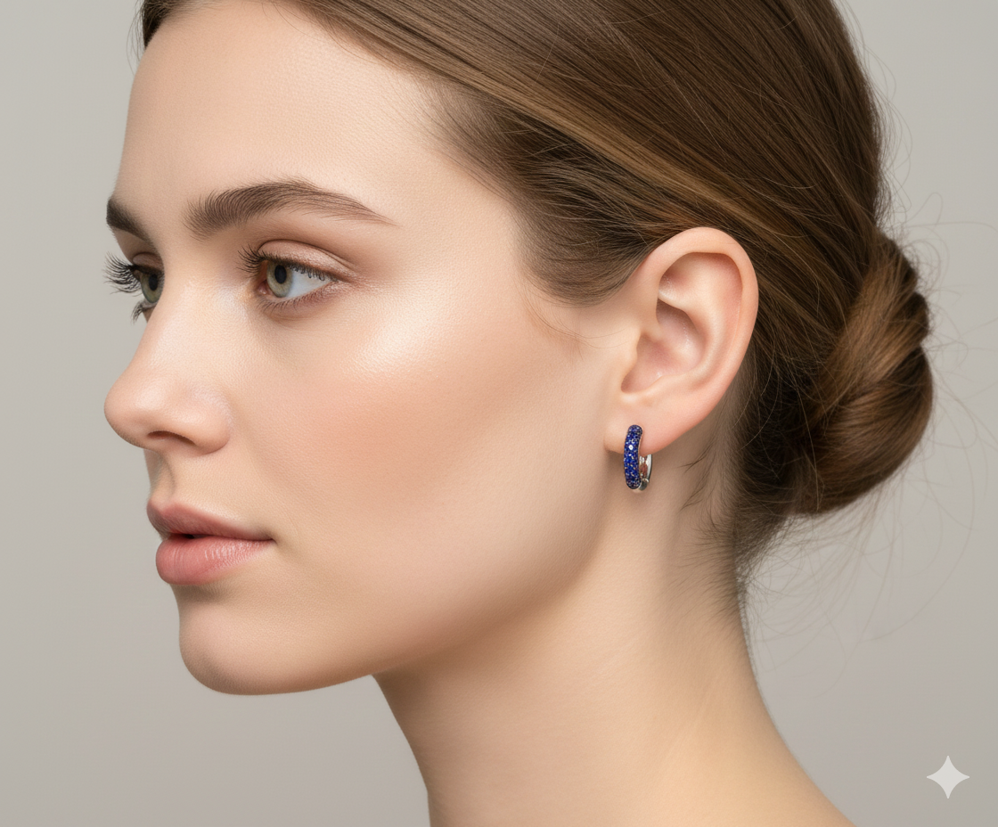 Pendientes criollas Fukuoka realizados artesanalmente sobre un fondo de oro blanco con pavé de zafiros.