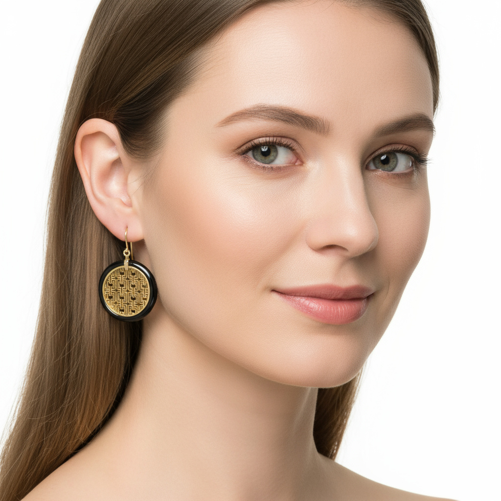 Pendientes Gamen realizados en oro amarillo con un círculo de ónix y un patrón tipo japonés.