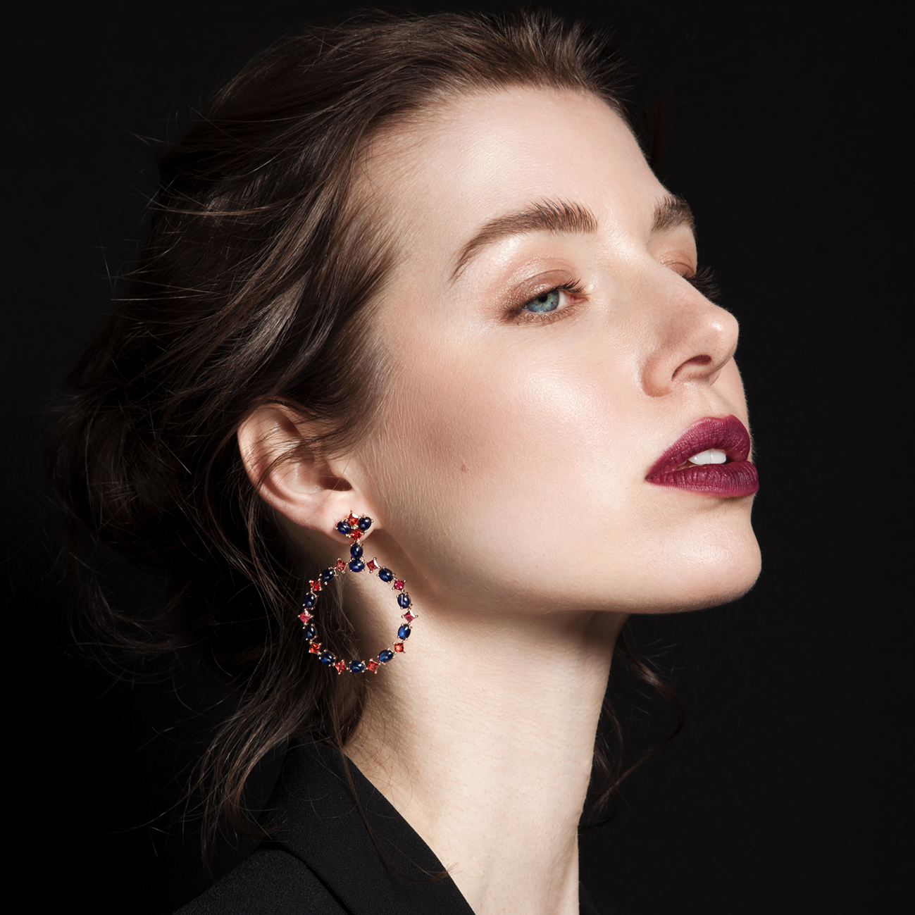 Pendientes en Círculo con zafiros azules en talla Cabujón y zafiros naranjas talla Princesa sobre un fondo cálido de oro amarillo.
