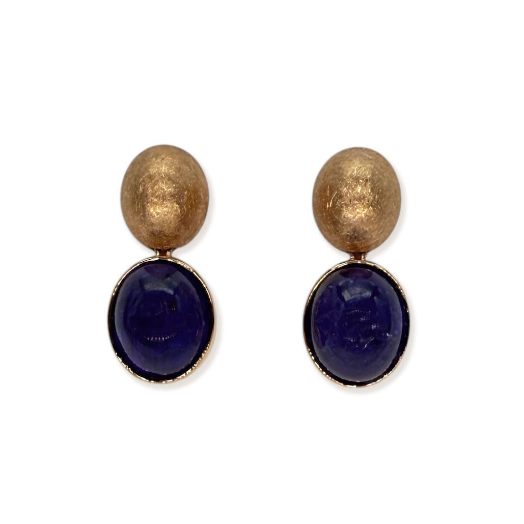 Pendientes realizados en oro rosa burilado con dos tanzanitas de color azul intenso talla cabujón.