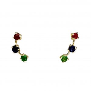 Pendientes trepadores con tres gemas: rubí zafiro y esmeralda engastados en una grapa de oro amarillo.