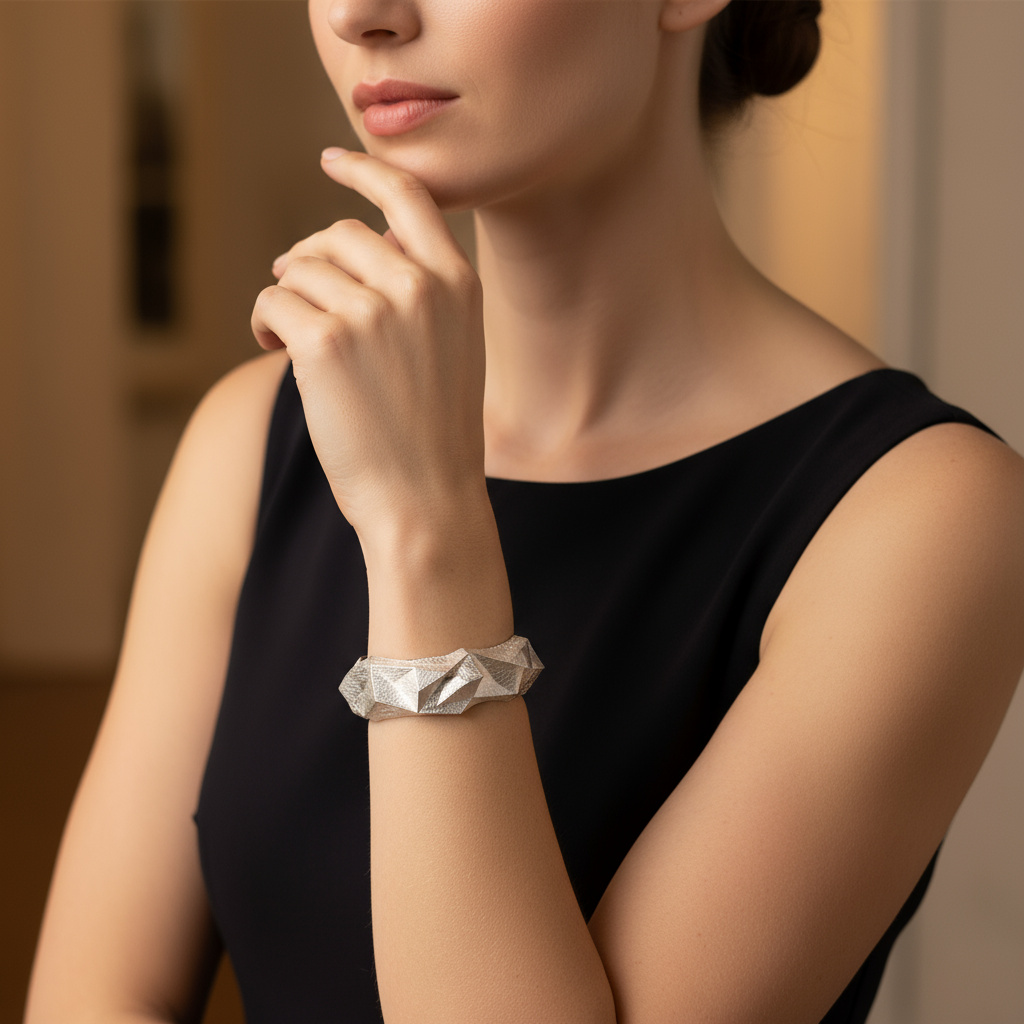 Pulsera Facet realizada artesanalmente en plata con acabado burilado y textura rugosa en la superficie de la plata.